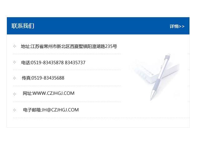 地址:常州市新北區友邦商務大廈1幢16、17層  電話:0519-85101652  傳真:0519-85112595  郵編:213022  網址:www_cz-jiayue_cn.jxxhtx.com  郵箱:xiajifengaa@163.com